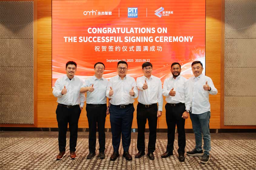 在各方见证下,东杰智能董事长韩永光、遨博智能董事长魏洪兴与PTT集团董事总经理Teo Swee Phin共同签署协议。